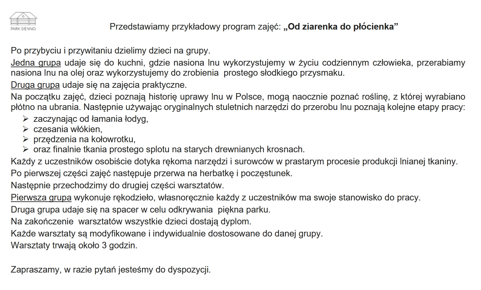 Zapraszamy na całoroczne zajęcia edukacyjno-warsztatowe w tradycyjnych pomieszczeniach z drewna, w otoczeniu pięknej przyrody (zabytkowy Park) z wykorzystaniem dawnych narzędzi.